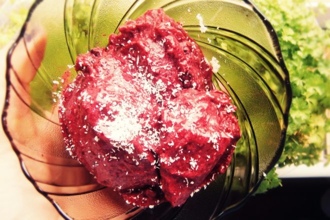 Această înghețată de mure se poate decora cu fructe și fulgi de nucă de cocos.