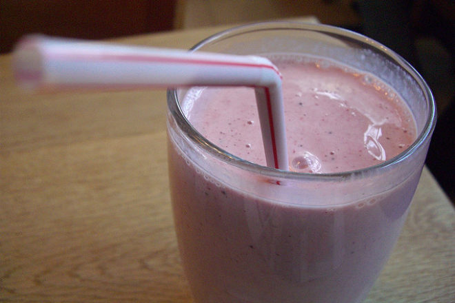 Milkshake-ul de banane şi fructe de pădure este o gustare delicioasă pentru cei mici.