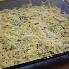 5. Se rade cașcavalul deasupra, se acoperă cu încă o foaie de aluat și se dă la cuptorul încălzit în prealabil până se rumenește (aproximativ 30-40 minute).