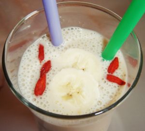 Pentru decor adaugă câteva felii de banane şi câteva fructe de goji deasupra.