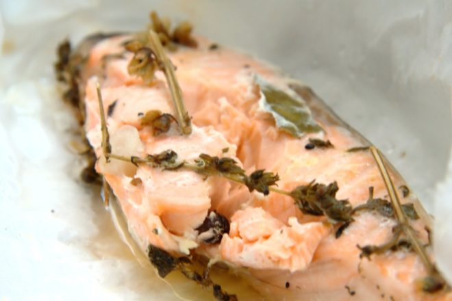 2. Se strânge în jurul somonului hârtia de copt și apoi cea de aluminiu și se pune în cuptorul pre-încălzit la 180 de grade timp de 15-20 de minute.