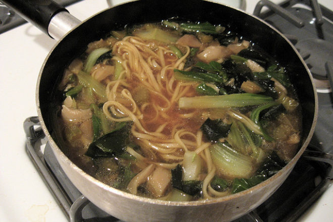 Stingeți focul, și adăugați tăițeii din orez, ceapa tăiată mărunt, sosul de soia și sare.